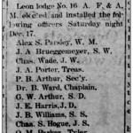 The first article was from 23 Dec 1910 and announces the newly elected officers of the Masonic Lodge in Leon, OK. Charley was elected to the position of Junior Steward. You can read more about Masonic officers here. The other article, dated 4 Feb 1910, merely mentions Charley visiting Leon for business, probably also related to the Leon Lodge . You can find many mentions of people visiting relatives and going to funerals and other events in the papers of that era. Folks were either nosy or hard up for news.