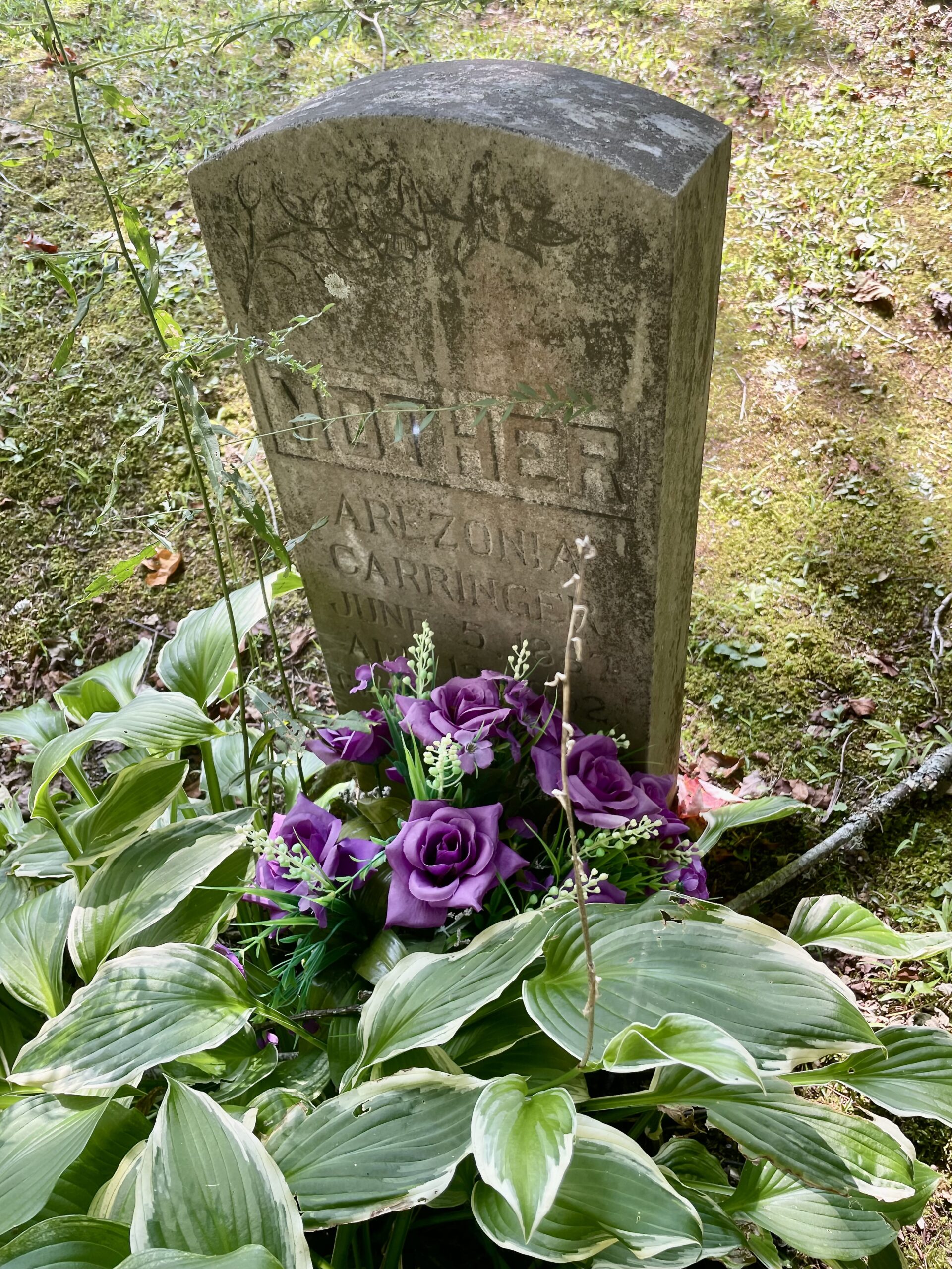 Arizona Jenkins (1887-1952) – I’ve seen her listed as Zonie and Zona, and some families have her name as Nancy Arizona. She married James Pearlie Carringer on 7 Jul 1907 at Harve and Josie’s. They had seven children: Lillie Mae (1915-2013), Virgie Marie (1917-1995), Lexie M (1919-2002), James Leonard (1920-1998), twins Maude Etta (1927-2015) and Claude Dennis (1927-1997), and Carmel Eugene (1930-1957). I mentioned Claude in a previous article about his cenotaph here. Arizona died in 1952 and is buried at Hazie Brown.