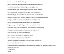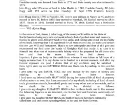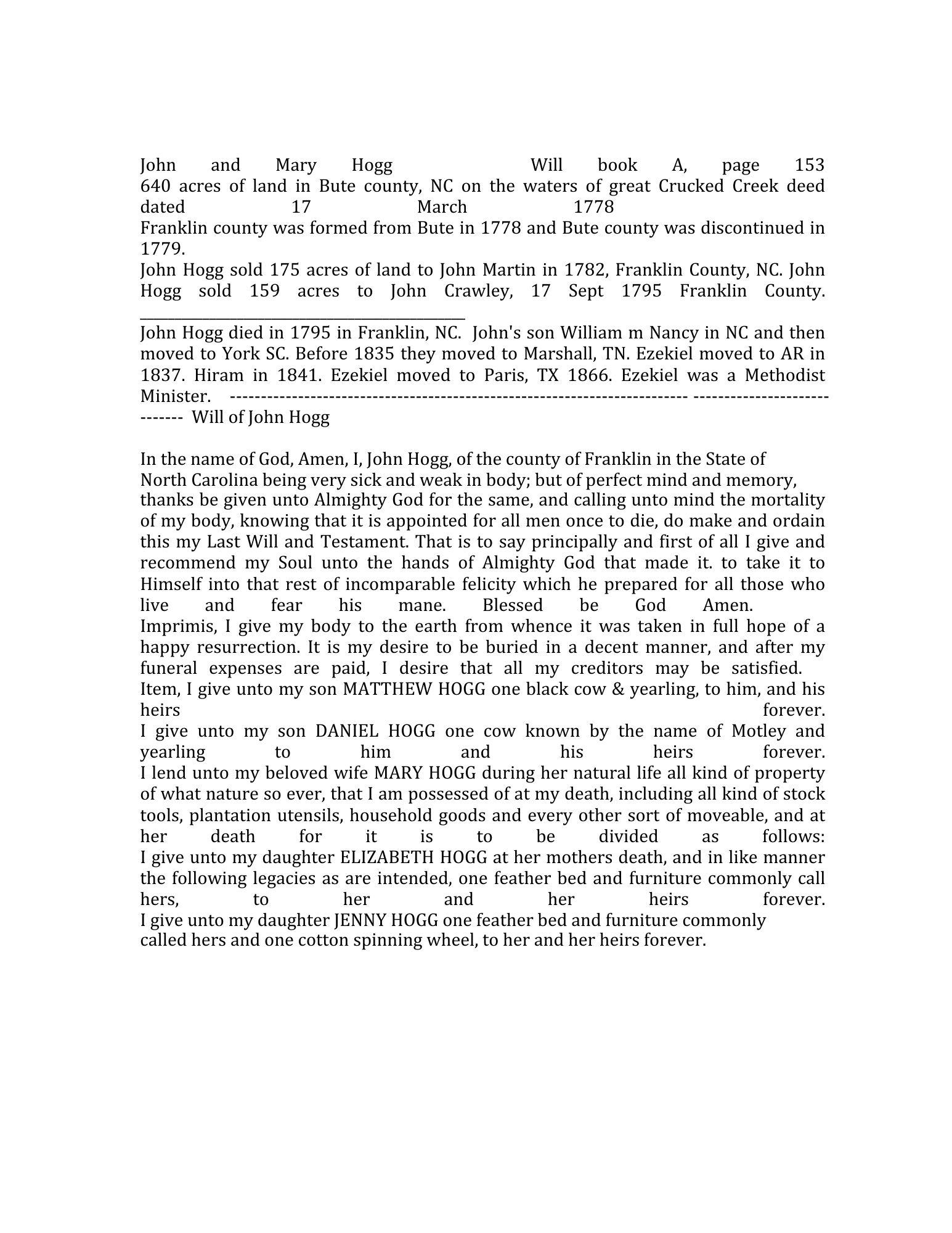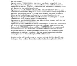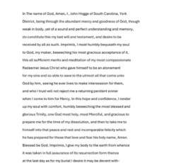 …not much, either. We know that he took his awesome fortune from the settlement of his father’s estate (five whole shillings) and moved across the border of North Carolina into the York District of South Carolina. Sometime after that, he added the “e” to our surname. Again, his will and probate comes into play. Most of what we know about John Hogg II comes from that document. Here is a transcription: